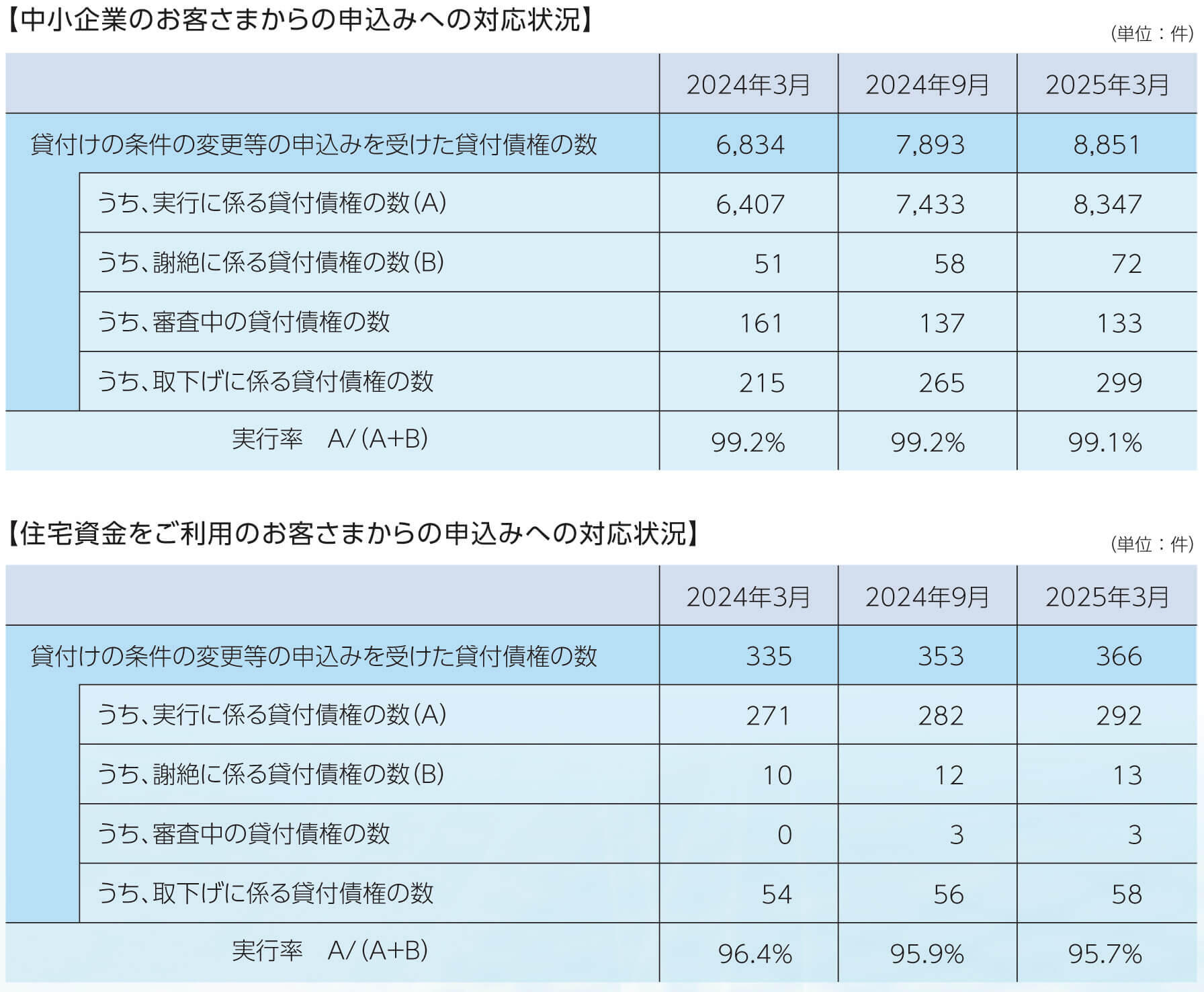 当行は、「地域密着と健全経営」を経営理念とし、地域のお客さまへの円滑な資金供給や経営改善に向けた取組みの支援など、地域密着型金融の推進に積極的に取り組んでいます。また、資源高や円安による物価上昇が、地域の中小企業のお客さまや住宅資金をご利用のお客さまに甚大な影響を及ぼしているため、新たな資金供給や貸付条件の変更などのお申し出およびご相談については、「金融円滑化に関する基本方針」にのっとり、真摯かつ適切に対応しています。