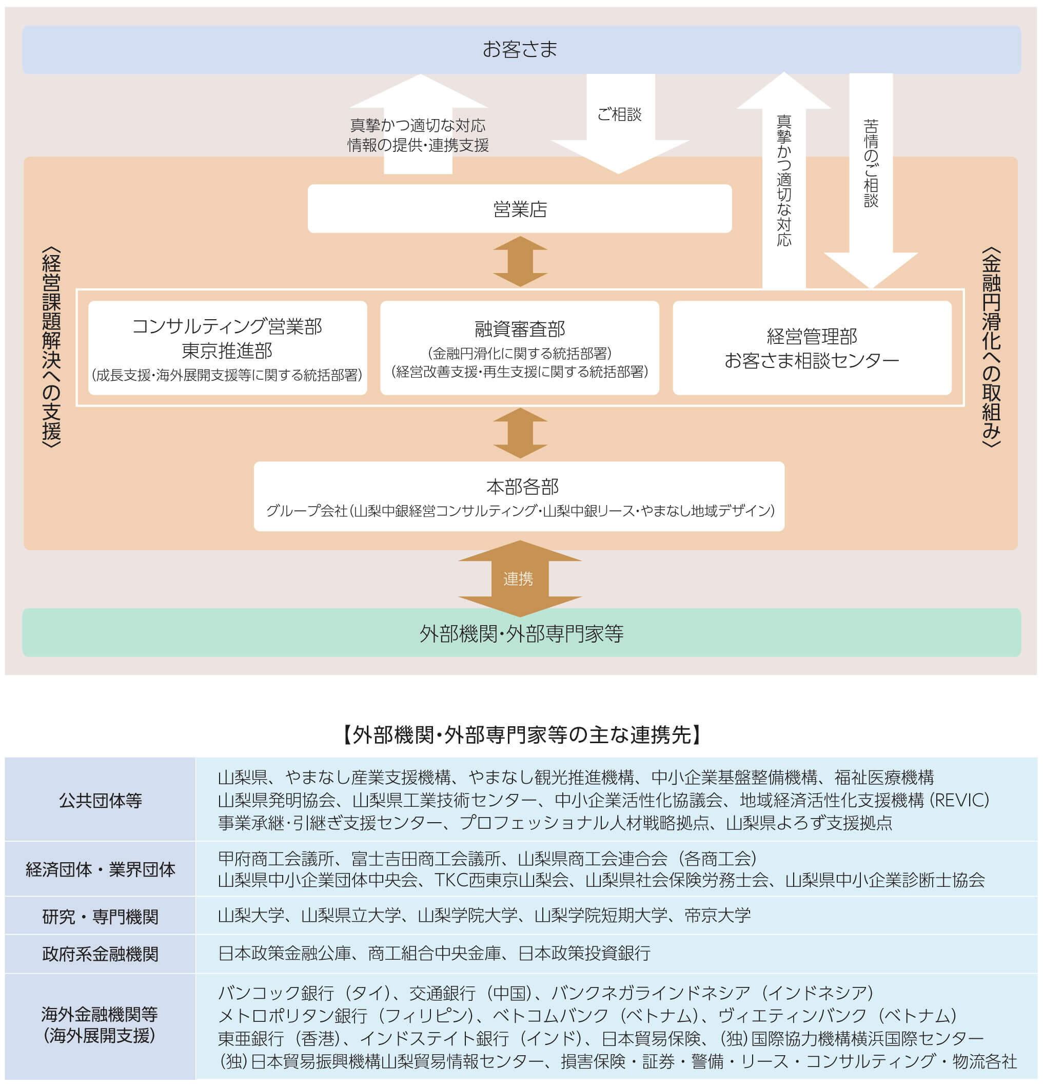 具体的には、当行グループ各社や外部機関、外部専門家などとのネットワークを活用し、お客さまが抱える経営課題の解決に適した機関の紹介、また、解決の進捗状況に応じた支援メニューの利用提案など、適時・適切なコンサルティングの提供に努めています。また、お客さまからの返済条件の変更などのお申し出に真摯かつ適切に対応するなど、円滑な資金供給や経営改善に向けての支援に取り組んでいます。