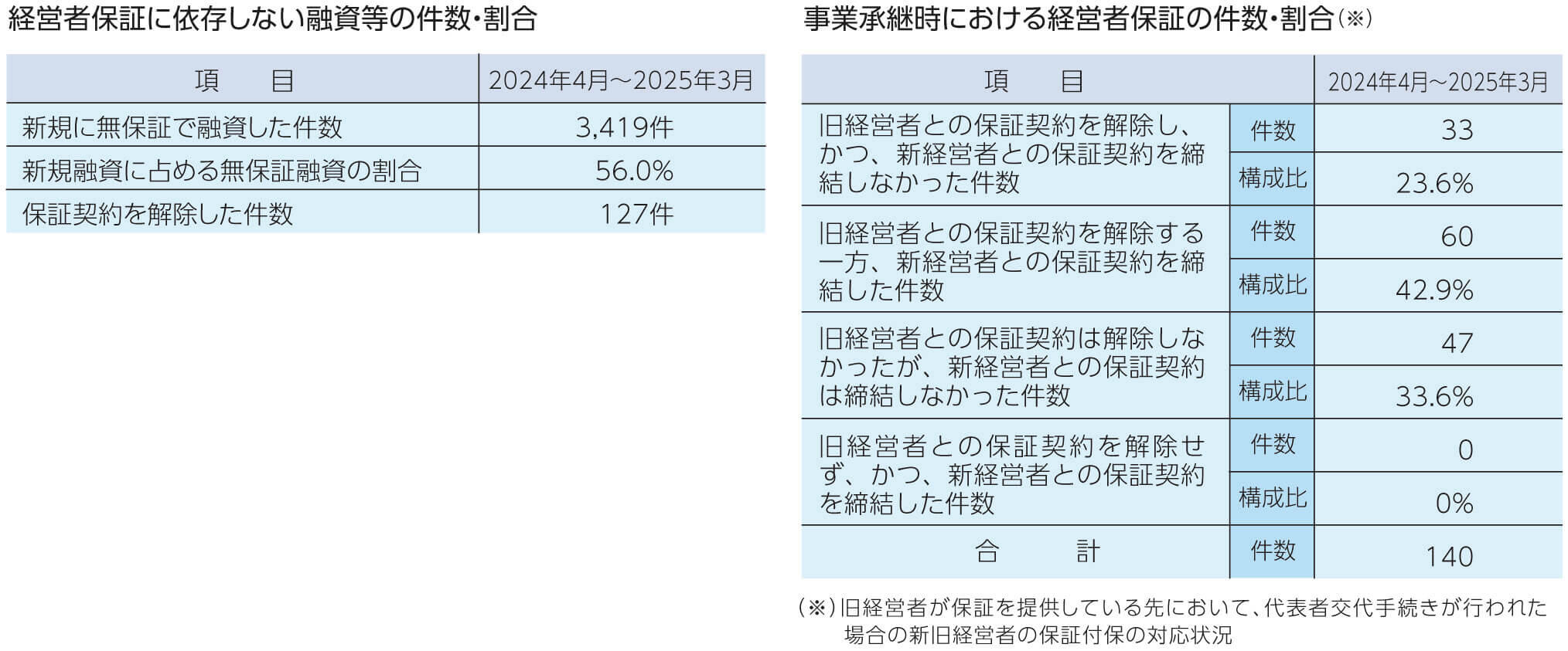お客さまに経営者保証を求める場合は、「どの部分が不十分であるため保証契約が必要となるのか」「どのような改善を図れば保証契約の変更・解除の可能性が高まるか」について、可能な限り定量的、具体的に説明いたします。また、共有した課題を解決するために、本業支援や経営改善支援に取り組んでまいります。 - 3.既存の保証契約への対応