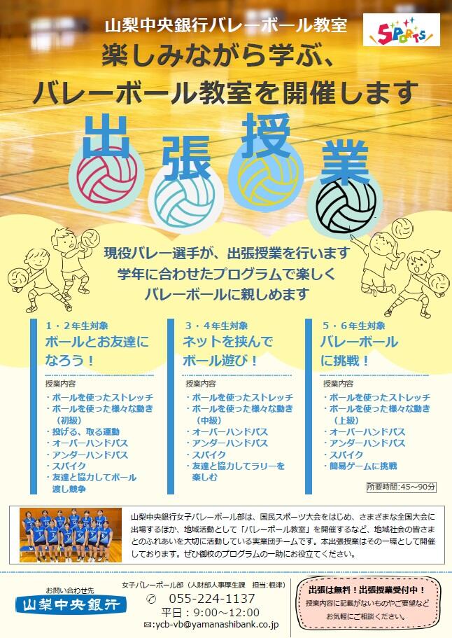 | 連絡先 | 〒400-0031 甲府市丸の内1丁目20-8 人事部人事厚生課内 女子バレーボール部 秋山岳人 TEL 055-224-1137 FAX 055-226-2781 Mail ycb-vb@yamanashibank.co.jp |