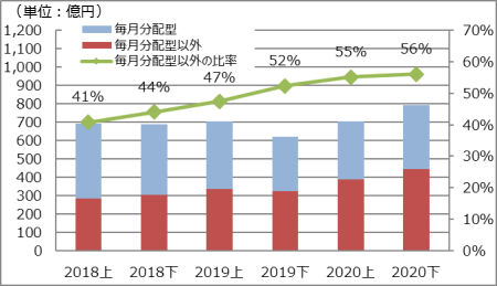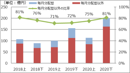 - 投資信託の基準価額は、2020年3月の新型コロナウイルスの感染拡大による世界的な景気減速懸念を背景に、一時的に急落しましたが、その後は回復に転じております。また、当行ではお客さまの長期・安定的な資産づくりニーズに対するご提案に取組み、投資信託のご購入(販売額)は増加傾向にあります。これにより、投資信託の残高は増加傾向にあり、販売額に占める毎月分配型以外の比率も高まりました。