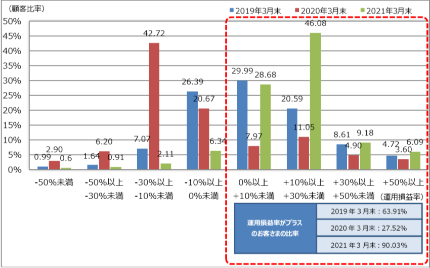 - 2021年3月末時点における運用損益率がプラスとなったお客さまの比率は90.03%となりました。