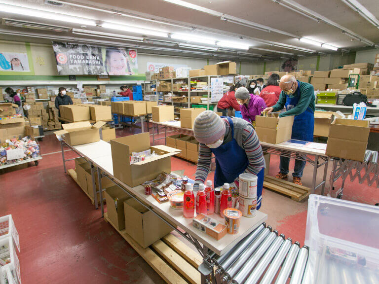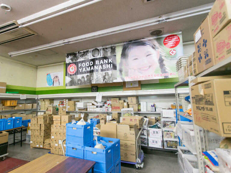 認定NPO法人フードバンク山梨では食料支援、食品ロスの削減、子どもへの学習支援などを行っています。フードバンクとは、安全に食べられるのに包装の破損、過剰在庫、印字ミスといった理由で、流通に出すことができない食品を企業などから集め、必要としている施設や団体、困窮世帯に無償で提供する活動のこと。日本では、1年間で500~800万トンの食べ物が捨てられています。