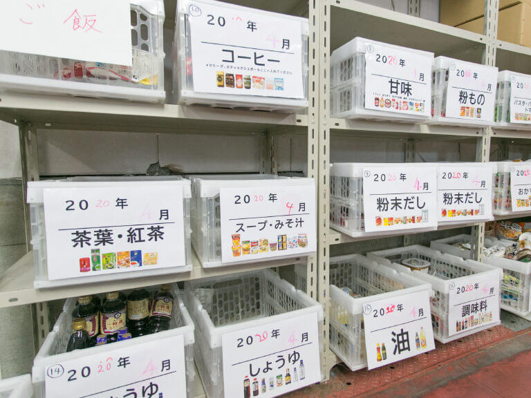 大量の食料が保管される倉庫で、賞味期限のチェックにも余念がありません。賞味期限がなくとも夏場など虫が出やすいお米は真空パックにして保管するなど衛生面にもキメ細やかな配慮が行き届いていました。