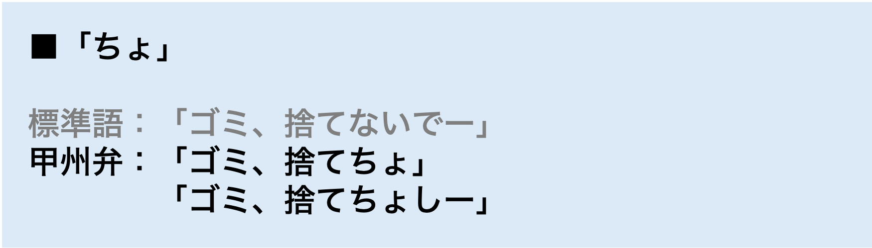 「ちょ」の使い方も独特だよね。甲州弁で「ちょ」は否定、禁止の意。そのあとに勧誘の「し」をつけて「ちょし」にしたり、「ちょしぃー」って語尾を伸ばせば、「しないでよー」って柔らかいニュアンスになるね