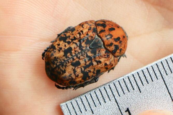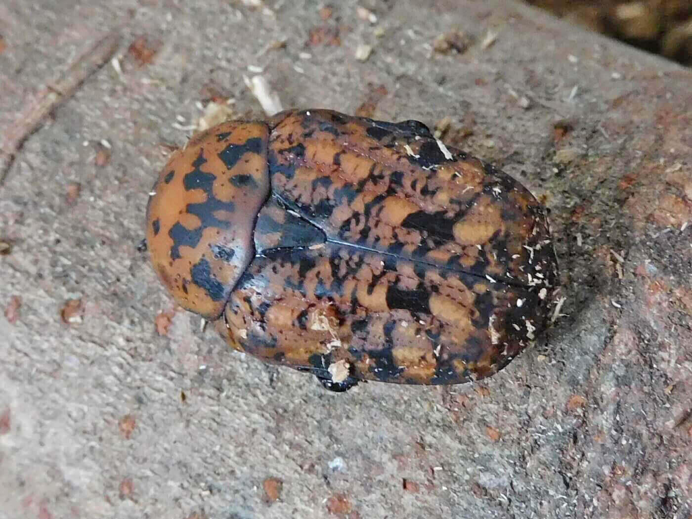 山梨県で見つけたアカマダラハナムグリオレンジ色の体に黒いまだら模様。虫好きな方なら、この模様がかなり斬新であることが分かると思います。