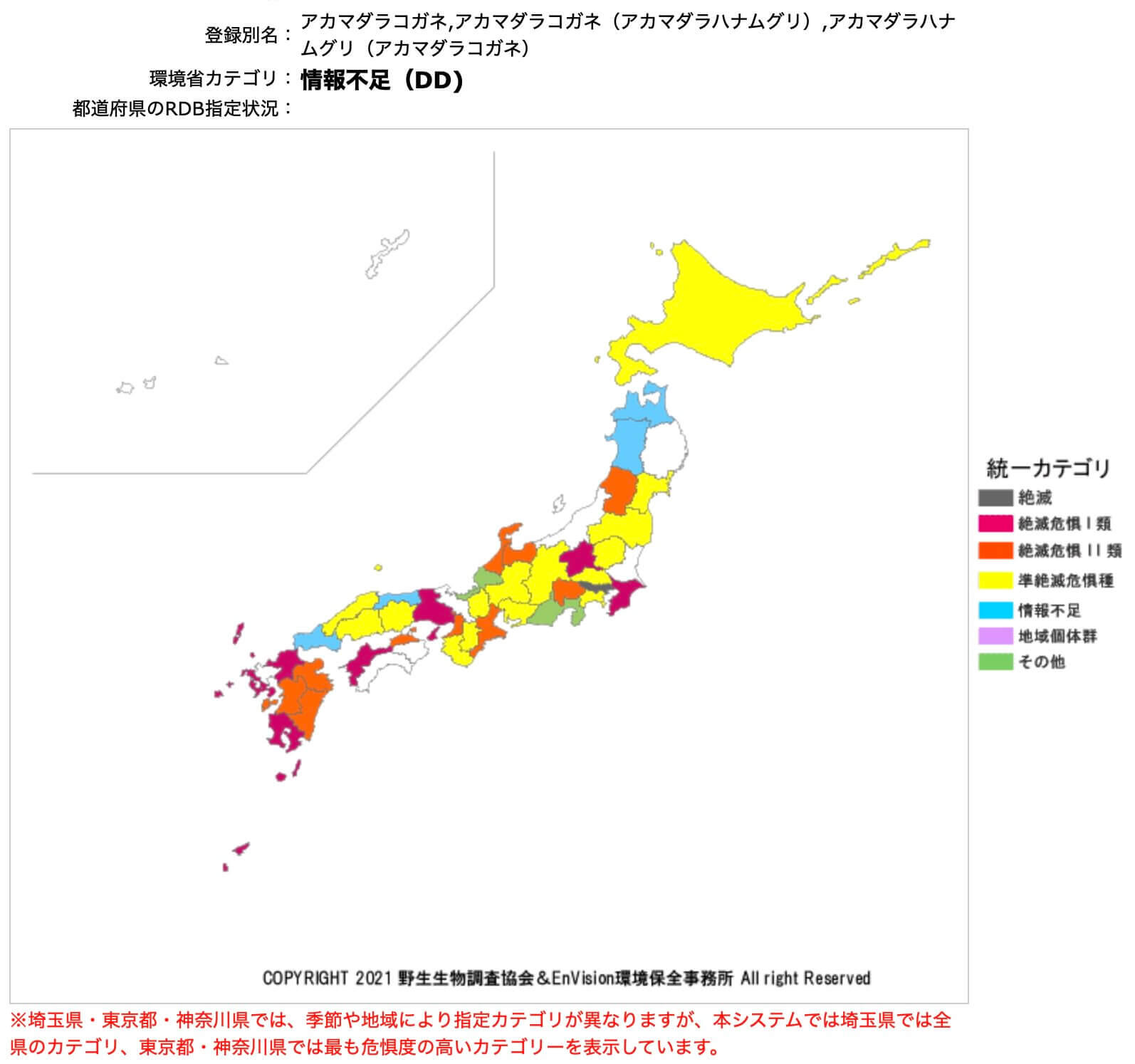 これは「日本のレッドデータ検索システム」(NPO法人野生生物調査協会・NPO法人EnVision環境保護事務所)というサイトが公開しているマップです。都道府県ごとのレッドデータベースの指定状況がひと目で分かります。