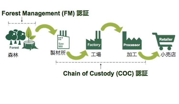 ②「CoC(Chain of Custody、加工・流通過程)認証」 FM認証森林から得られた認証材が加工から消費者に届くまでの流通の過程を認証する