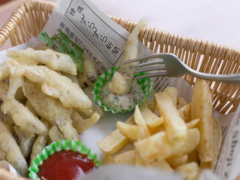 フィッシュ&チップスは白身魚のフライに、棒状のポテトフライを添えたもの。英国ではファーストフードとして親しまれています。精進湖版の「フィッシュ&チップス」は精進湖でとれた新鮮なワカサギと地元のじゃがいもを使用したフライドポテトが添えられています。もともと周辺地域ではワカサギの天ぷらがあり、扱いなれている食材であることが開発の経緯にあります。