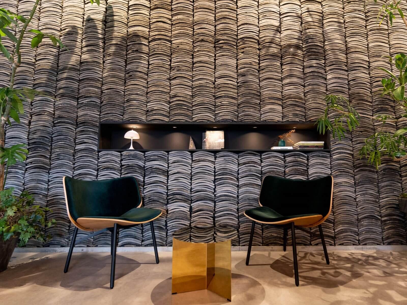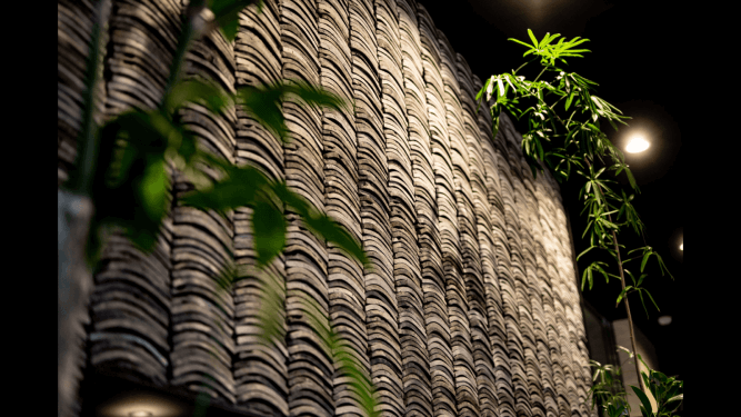 ガラス張りで開放的な店内では、インテリアに瓦が使われています。ずらりと並んだ瓦の壁の重厚な雰囲気を活かしつつ、家具や装飾はシンプルなものを選び、すっきりと。"開かれた大学"を目指す山梨学院大学とともに、足を踏み入れやすい空間を意識して店舗を作り上げたそう。学校という生徒が年々入れ替わり常に変化していく場所において、icciの世界観をどれだけ表現できるのか。ただのおしゃれなカフェではなく、瓦を使用し、和風の内装にすることで、変わらない日本の伝統や文化を感じられる、伝えられる場所を目指しました。