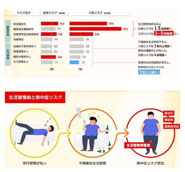 また、熱中症は日々の生活習慣も大きな関係があると言われています。高血圧・高脂血症・糖尿病などの生活習慣病があると熱中症診断リスクは1.5倍程度に、入院リスクは2~5倍程度に跳ね上がります。たとえば、継続的な歩行習慣で生活改善を行い、暑さに「からだ」を慣らすことで熱中症の重症化を予防する効果があることが期待されています。生活習慣の改善も図っていきましょう。