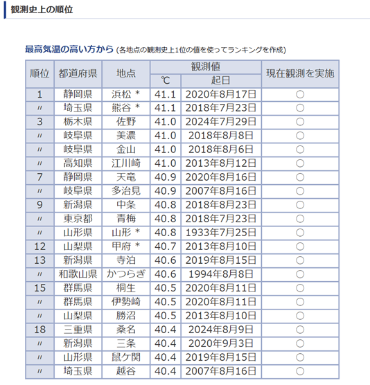 熱中症についてここまでお話をしてきましたが、山梨県のことも紹介したいと思います。甲府市では2013年8月に歴代12位の40.7度を観測しております!!