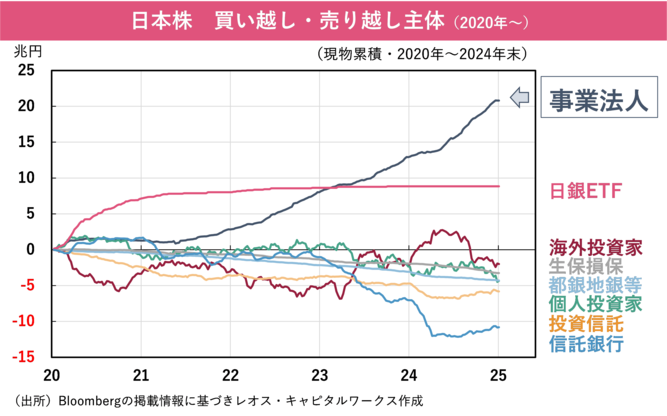下図は東京証券取引所が毎週公表しているデータ(および日本銀行のETF買い入れ実績)ですが、これを見ると、過去5年で最も大きく日本株を買い越しているのは「事業法人」ということがわかります。