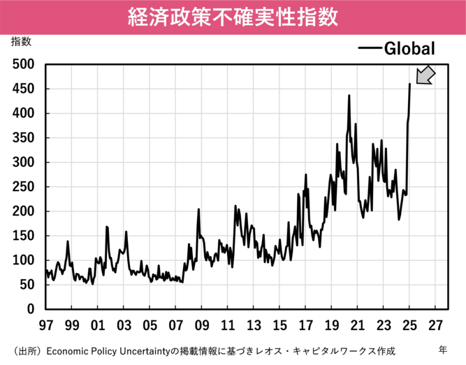 過去と比べても非常に不透明感が強まっています。世界20ヶ国以上の新聞に登場する経済・政策・不確実性に関する言及頻度を指数化した「経済政策不確実性指数」を見ても、過去最高水準となっています。