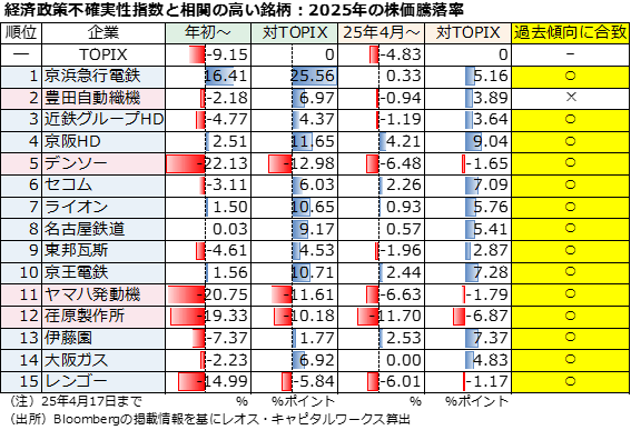 これらの銘柄は、今回の局面で実際どのような株価パフォーマンスになっているでしょうか? 次の表は、2025年4月17日時点までの、先ほどの15銘柄について、2025年の株価騰落率および対TOPIX超過リターン、2025年4月の株価騰落率および対TOPIX超過リターンを掲載したものです。