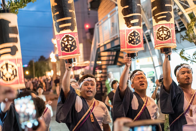 パパに肩車をされて、遠くまで続く大松明の列を口を開けて眺める子供。おばあちゃんに手を引かれ、屋台に並ぶジューシーな焼き鳥やお菓子を買ってもらう子供。ビール片手に盛り上がる海外からの観光旅行グループ。幸せそうに寄り添って、スマホで2ショットを撮るカップル。汗を滴らせながら今年の火柱を見守る氏子の面々。