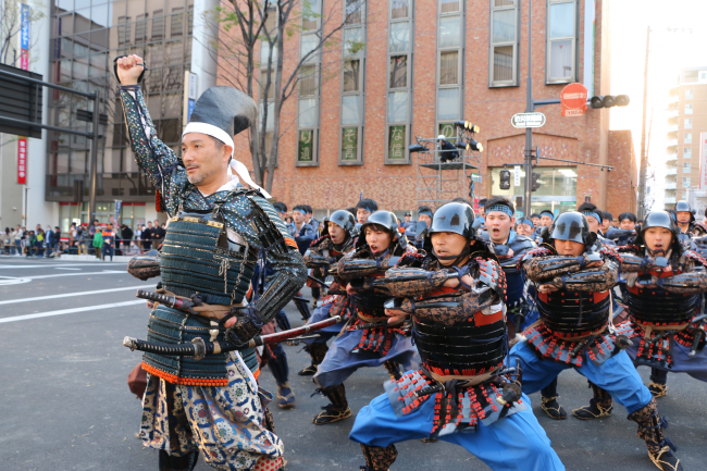 隊のパフォーマンスは、平和通りで行われるパフォーマンスエリアだけではありません。街を歩いていた各隊が、突然ほら貝やドラを鳴らして勝どきや殺陣を始めたり、いきなり踊りが始まったりと街中でもパフォーマンスが楽しめます。武田典厩信繁隊では、HAKA―ハカ―(ニュージーランドのマオリ族の戦士が自らの力を誇示し、相手を威嚇する伝統舞踏)を模し、川中島の合戦を前に戦う意気込みを示すパフォーマンスを披露しました。