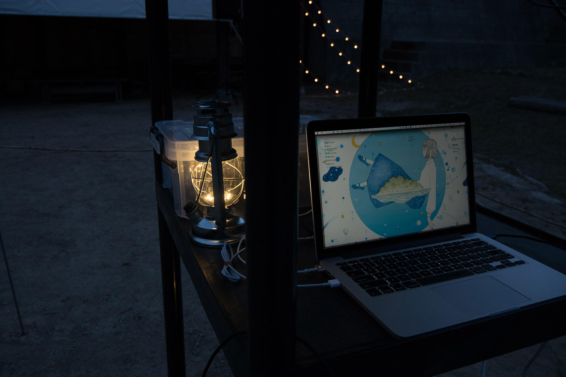 会場の真ん中、機材が濡れないようにビニールをかけながらスクリーンを見つめる主催者・佐藤大輔さんの姿もそこにありました。