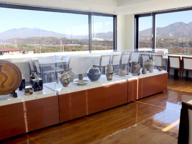 展示の中心は主に女流作家の作品です。大村博士は女子美術大学と関りがあったこともあり、女流作家に深い思い入れを感じているといいます。また、戦後の日本画壇を代表する鈴木信太郎の作品を常設で展示する展示室では、スケッチブックなど貴重な資料を展示しています。2階展望室は大村博士の想いが込められて、韮崎市内と周囲の山々を眺望できるつくりになっており、併せて陶磁器と山梨ゆかりの作家の作品を展示しています。