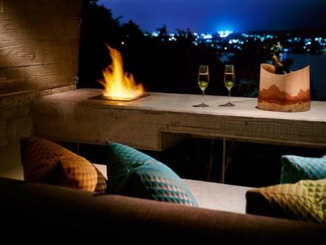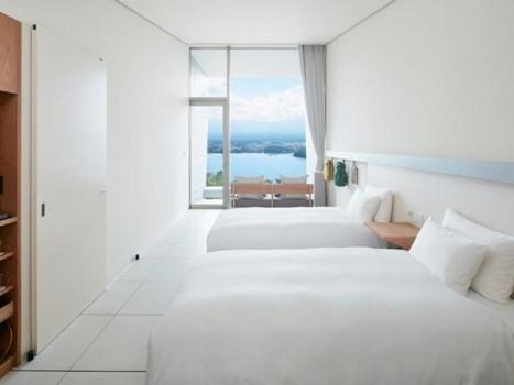ダイニングとフロントを備えたメイン棟が滞在の拠点となる。客室はスコープ状のモダンデザイン。全40室が河口湖に面し、オーシャンビューならぬレイクビューになっている。過剰な広さや設備を排除したシンプルな客室だが、星のや 富士は河口湖を見下ろす丘陵地に位置する特殊な設計になっているため、空に浮かんでいるような開放感を味わえる。バルコニーにはベンチがあり、寒い時期でもこたつが設置されるので備え付けのダウンコートを着て、ぬくぬくと美しい眺望を満喫できる。