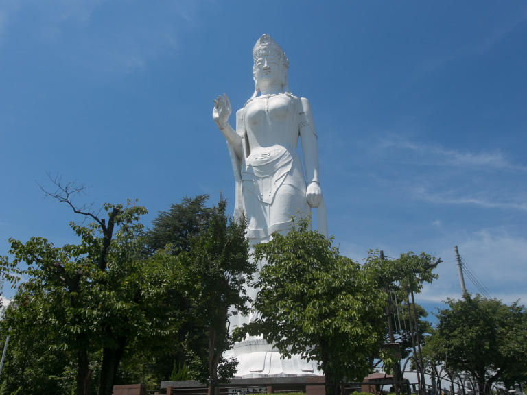 韮崎のランドマーク、アメリカヤの裏手に位置する七里岩南端。富士山を見渡す小高い丘の上に、平和観音があります。韮崎の町を見つめるように立っている観音様は身長16.6メートル(台座を入れると18.3メートル)、体重は308トン。この巨大な観音様は、昭和34年8月に着工し、2年2ヶ月の月日をかけ完成されました。この観音様は市民の平和と無限の発展の祈りを込められて建立されたもの。韮崎の人たちの地元を思う気持ちが伝わってきます。ただそこにある、それだけで完結するものは美しく、見る者を魅了します。