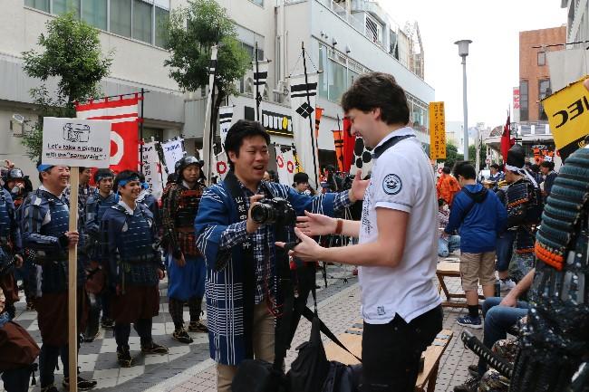 24将の隊の甲州軍団は、舞鶴城への集結前に甲府市内に設けてある各陣屋に集まります。武田典厩信繁隊が入陣するオリオン陣屋では、入出陣式が行われる他、記念写真の撮影や、英語や中国語による信玄公祭りのガイドなどで観光客のみなさまをもてなしました。隊士の武具に触れたり、記念撮影できるのもこの祭りの特徴の一つです。