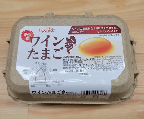 赤身が特徴の鶏卵です。明野のたまごと同様、飼料に遺伝子組み換えでないトウモロコシ を使用しています。さらに、地場ワイナリーのぶどうの絞り粕(ワインパミス)を加えた飼料にて肥育されます。たまごの中にポリフェノールが含まれ、健康志向の高いお客さま中心に支持を得ています。